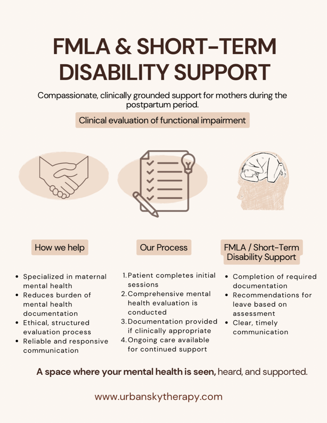 At Urban Sky Counseling, we provide postpartum mental health evaluations for mothers who may need additional emotional support, treatment, and time away from work to focus on recovery.